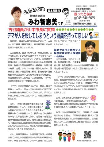 「デマ」の流布問題については、関東大震災で朝鮮人、中国人、日本人のろうあ者などがデマにより虐殺された事件について取り上げ、デマにより殺人が起こったことについて、市長の見解を求めました。